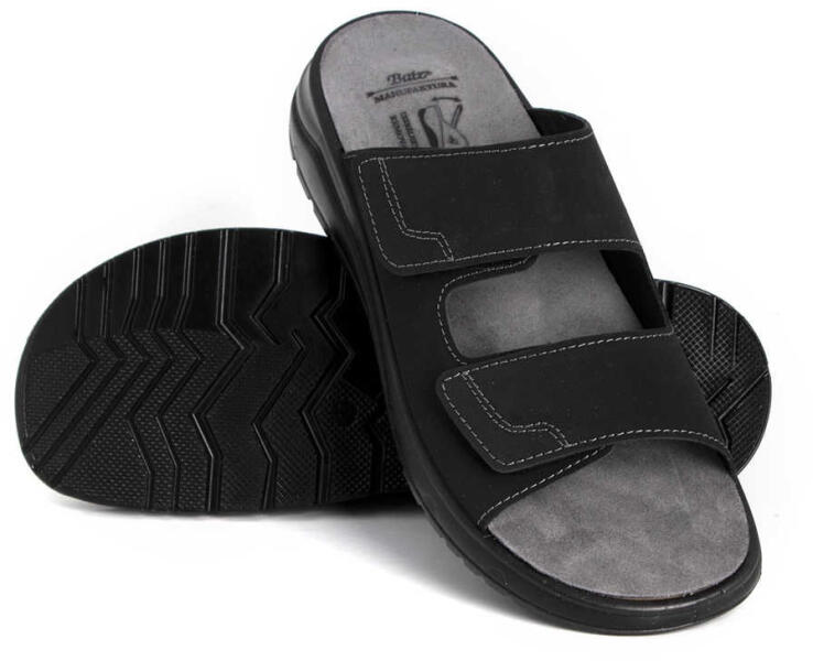 Batz férfi egészségügyi papucs ERIK - Férfi egészségügyi papucs bőrből, anatómiailag formázott talppal és csúszásmentes talppal. Emellett 2 állítható tépőzáras csattal rendelkeznek, amelyek segítségével bármilyen lábfejre illeszkednek. Anyagok: